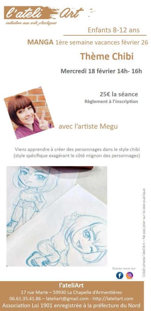 rejoignez l’illustratrice Megu 2 mercredis par mois pour découvrir la culture manga et Japonaise (mode, gastronomie…)