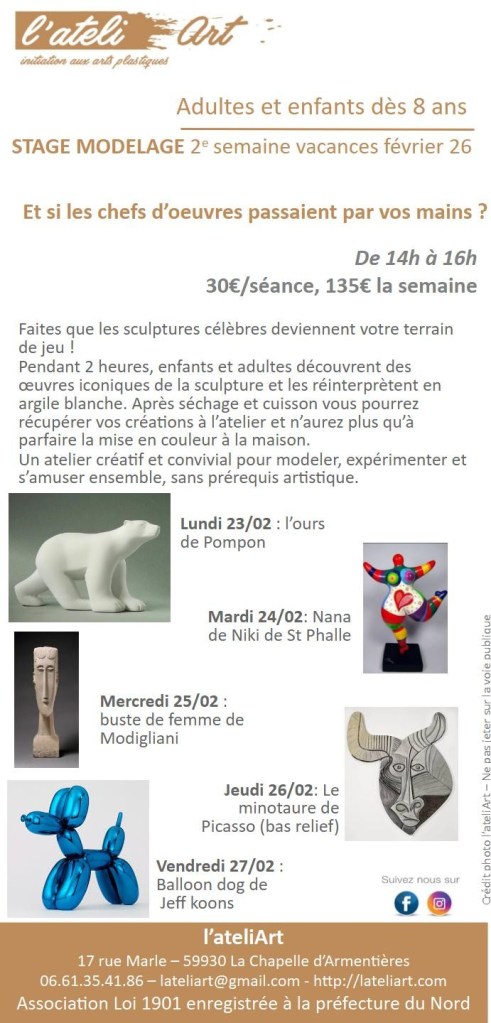 encadrés par notre intervenante référente en modelage, venez vous essayer à un exercice d’observation en modelant votre propre statue à partir d’un modèle vivant.