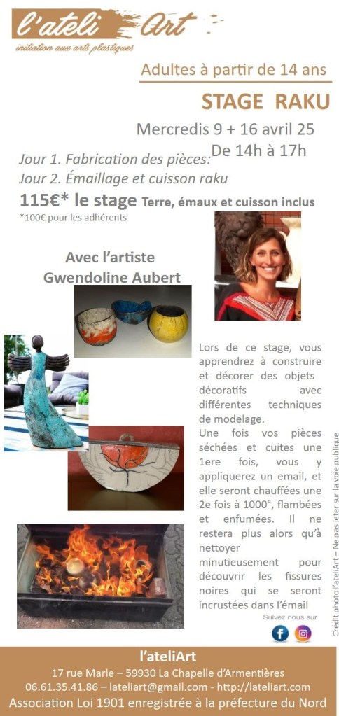 tous les 2 mois environ, une cuisson raku est organisée avec les élèves de l’atelier. Vous pouvez assister à cette séance ou vous inscrire pour les futurs stages. Prochaine cuisson printemps 26